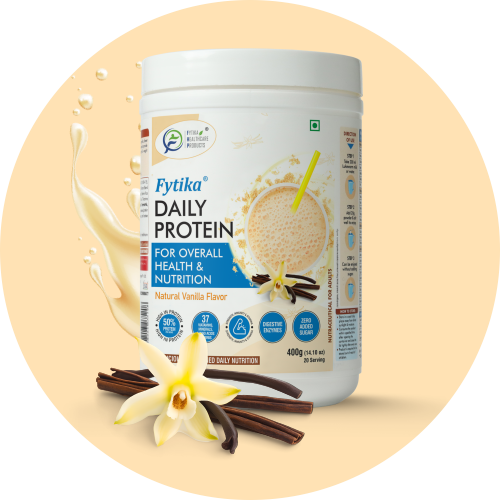 Fytika Daily Protein offers a meticulously crafted blend for comprehensive health and nutrition. This premium formula combines high-quality protein with 37 essential Vitamins, Minerals, Amino Acids, Ashwagandha, Sweet Moringa Powder, Gokshura(Tribulus Terrestris) and a blend of digestive enzymes. It is 100% natural and yet tastes delicious with a rich natural vanilla flavor.