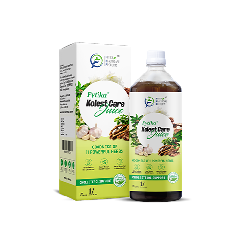 Fytika Kolest Care Juice is an Ayurvedic formulation made with herbs like Arjun Chhal and Shankpushpi that help manage cholesterol levels, improve blood circulation, and support overall heart health.