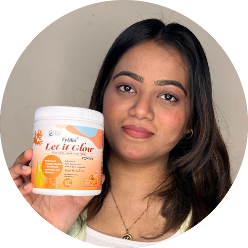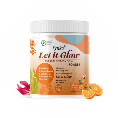 Fytika Let It Glow collagen supplement is a potent blend of Marine Collagen, L-Glutathione, Hyaluronic acid, Vitamin C, and Biotin, that aids in maintaining skin elasticity, reducing fine lines and wrinkles, and promoting healthy hair and nail growth.