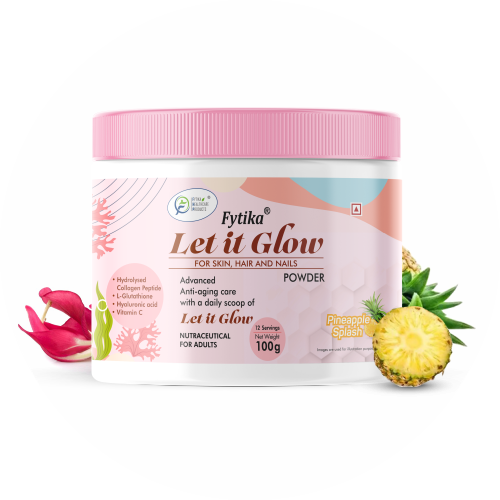 Fytika Let It Glow collagen supplement is a potent blend of Marine Collagen, L-Glutathione, Hyaluronic acid, Vitamin C, and Biotin, that aids in maintaining skin elasticity, reducing fine lines and wrinkles, and promoting healthy hair and nail growth.